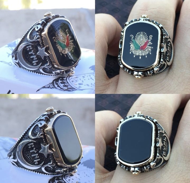 925 Ayar Çift Taraflı Devlet armalı Gümüş Erkek Yüzük Kendi firmamızın üretimidir. ”Ay yıldız Lazer Kesimdir ” Çift Taraflı Ürünlerimize Her İki Tarafına Farklı İsim Ve Logo Yazdırabilirsiniz (yazılan isimler için ayrıca fiyat ilave edilir ) Ürünlerimizin tamamı 925 ayar gümüşten üretilip doğal taşlar ile tasarlanmaktadır. Ürünlerimiz Türkiye’ nin her yerine sigortalı olarak gönderilmektedir. — Kişiye özel ürün siparişleri için lütfen bizimle iletişime geçiniz.–