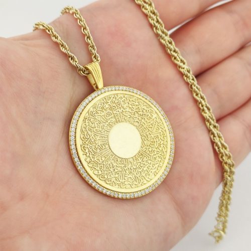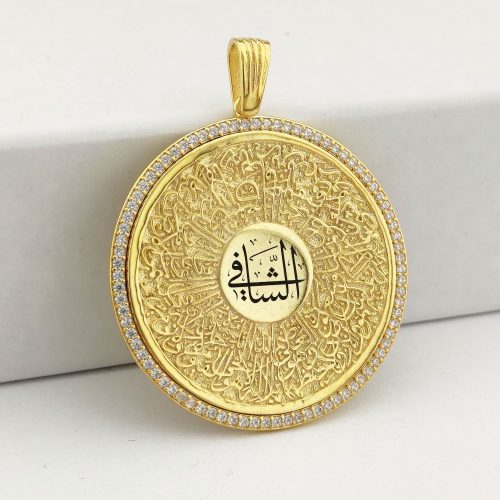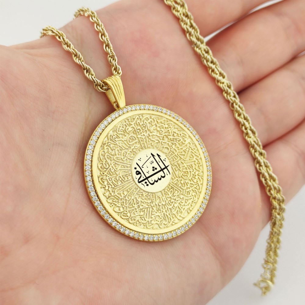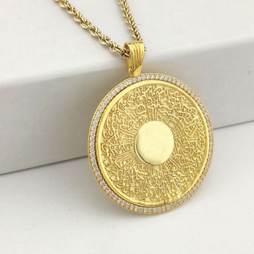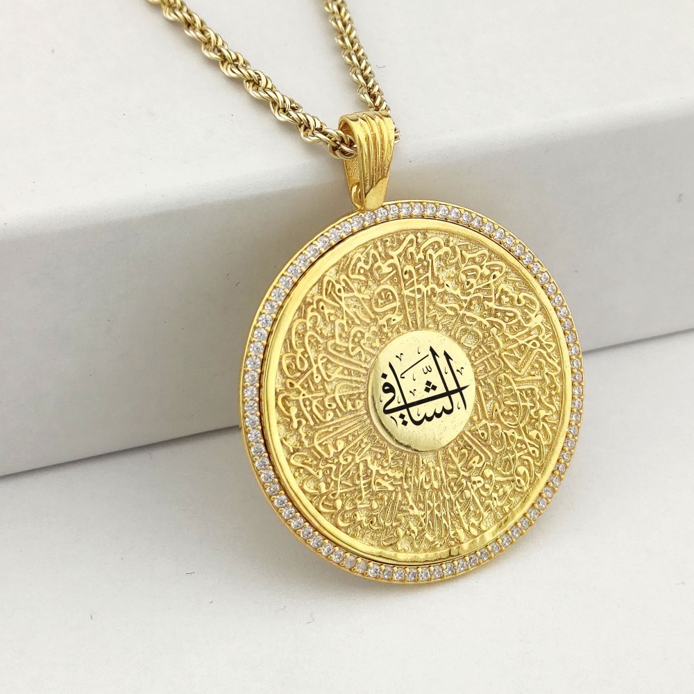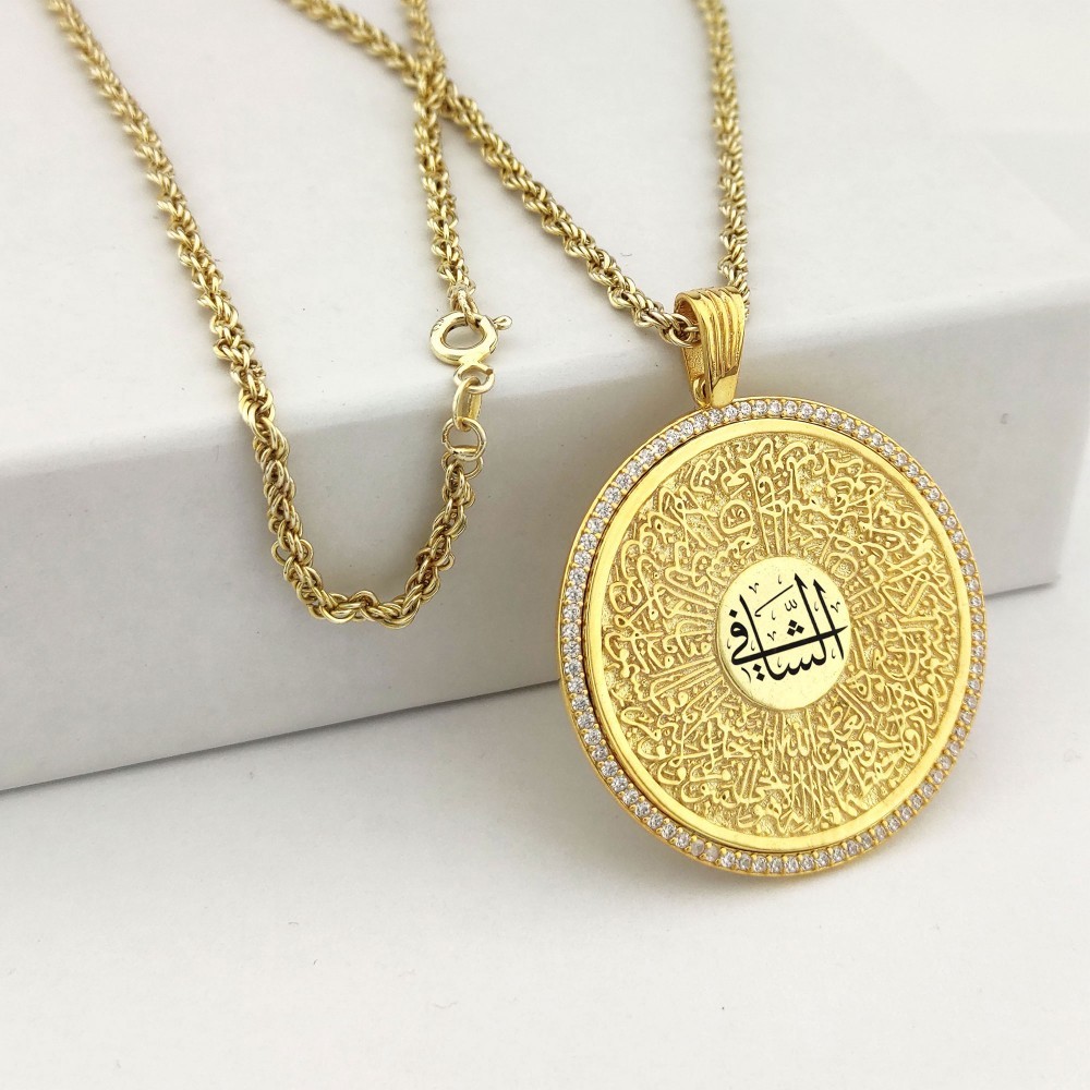 925 Ayar Gümüş Beyaz Taşlı Ayetel Kürsi Yazılı Madalyon Kolye ve 55 cm Zincir