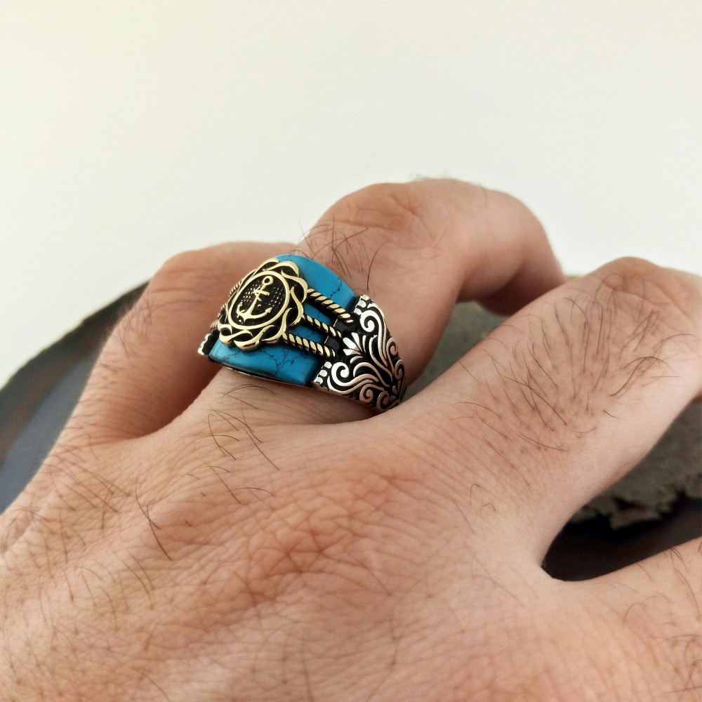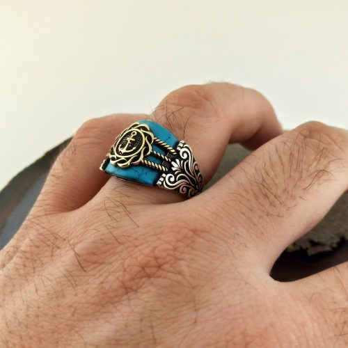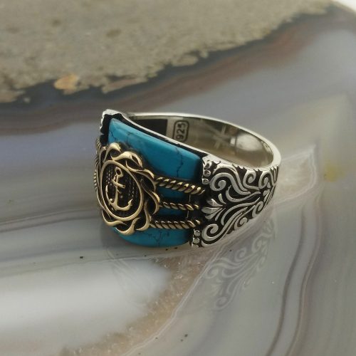925 Ayar Gümüş Firuze Taşlı Denizci Çapası Erkek Yüzük