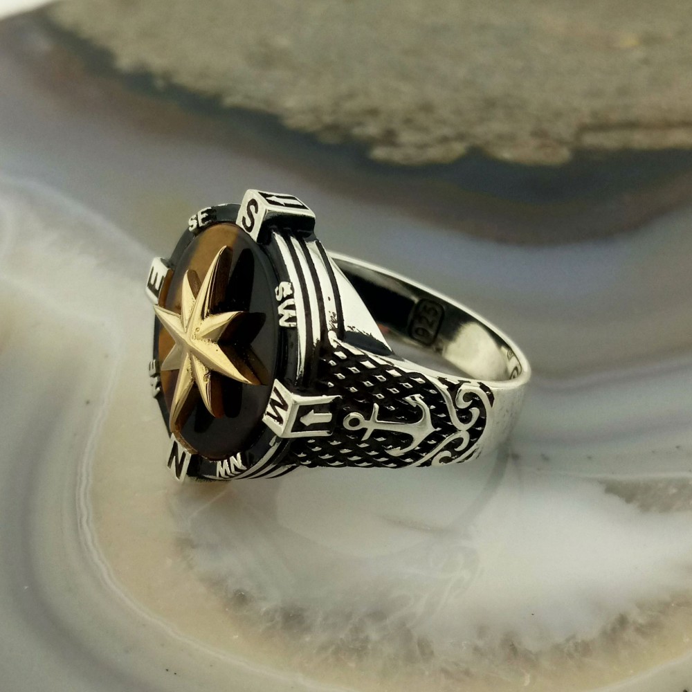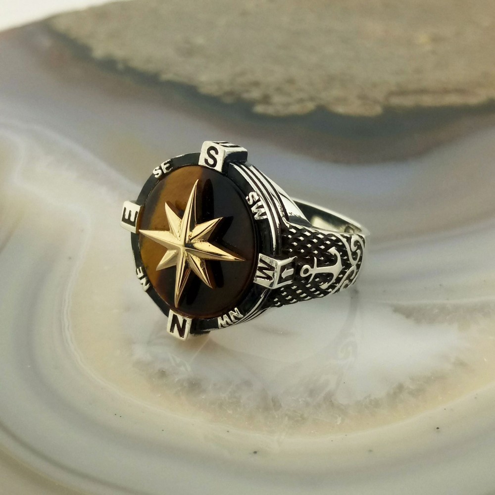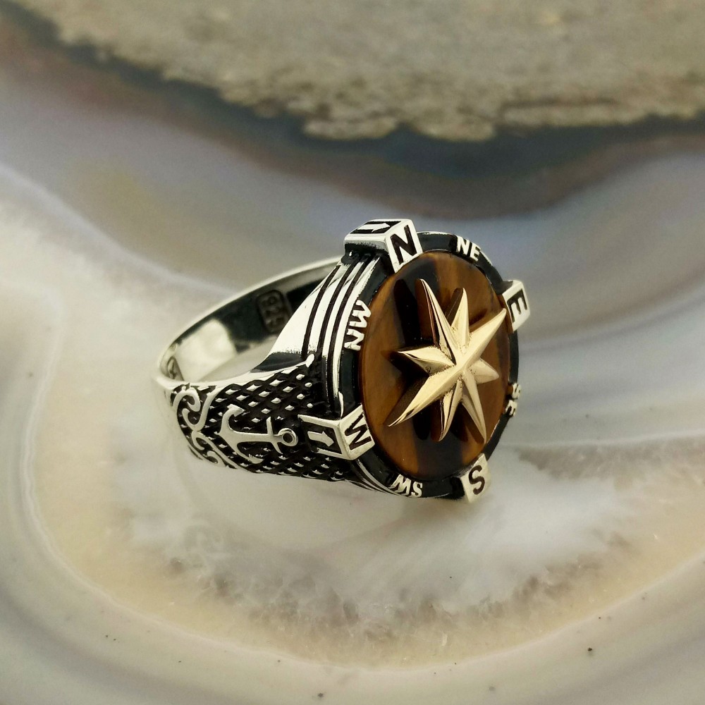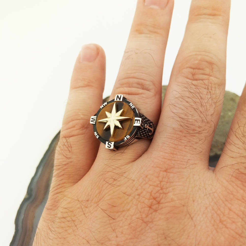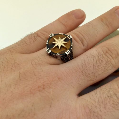 925 Ayar Gümüş Kaplan Gözü Taşlı Pusula Erkek Yüzük