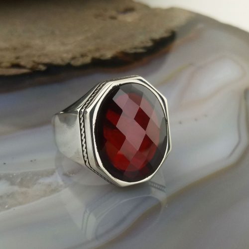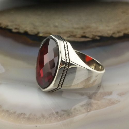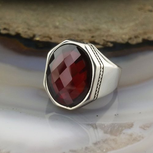 925 Ayar Gümüş Kırmızı Faset Taşlı Erkek Yüzük