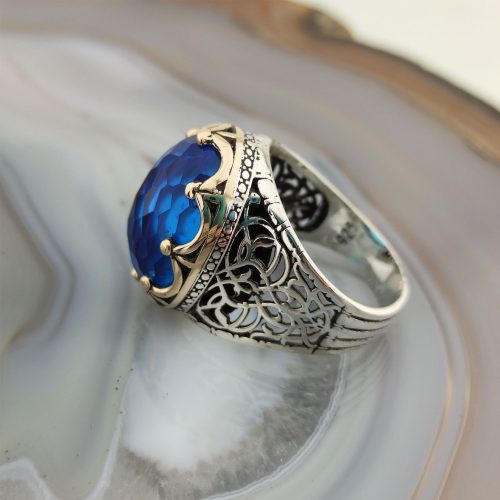 925 Ayar Gümüş Mavi Taşlı Kral Tacı Erkek Yüzük