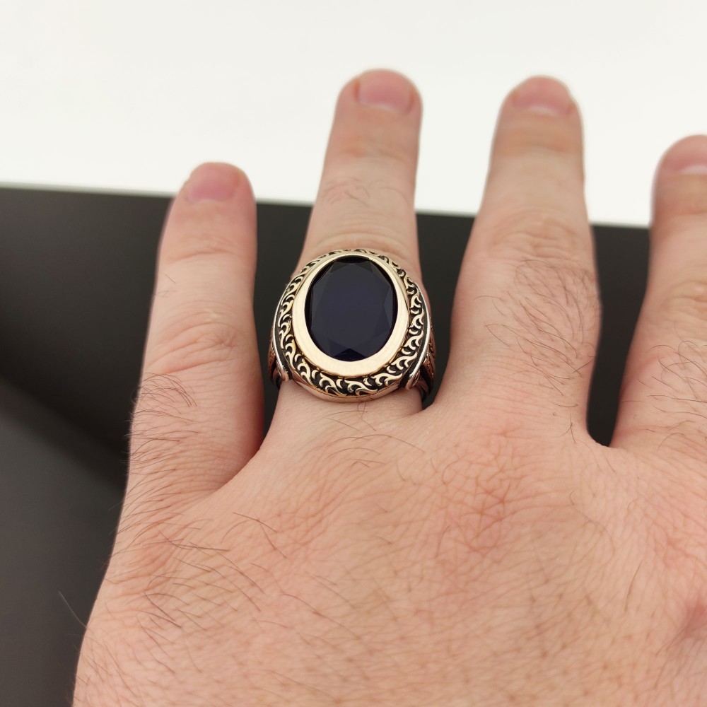 925 Ayar Gümüş Mavi Taşlı Sütun Detaylı Erkek Yüzük