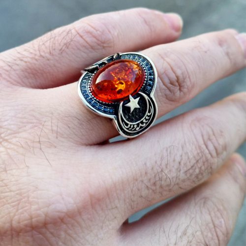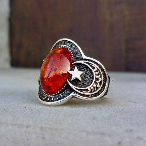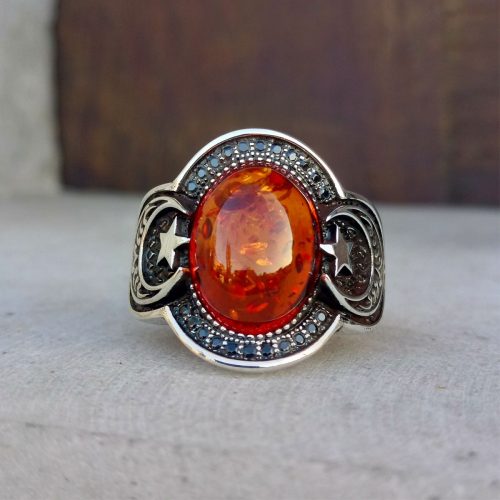 925 Ayar Gümüş Mikro Sıkma Kehribar Taşlı Erkek Yüzük