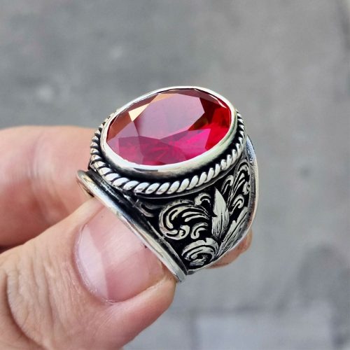 925 Ayar Gümüş Motif İşlemeli Kırmızı Taşlı Erkek Yüzük