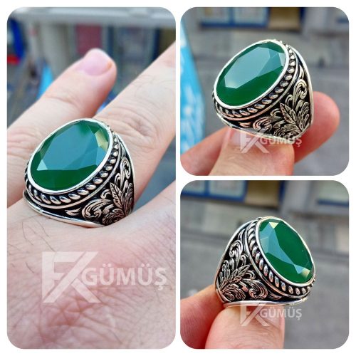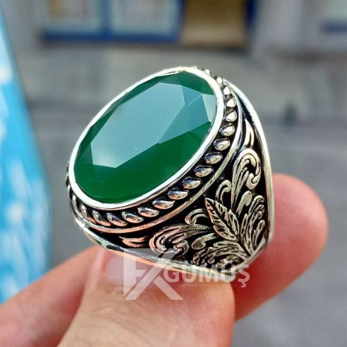 925 Ayar Gümüş Motif İşlemeli Yeşil Has Taşlı Erkek Yüzük