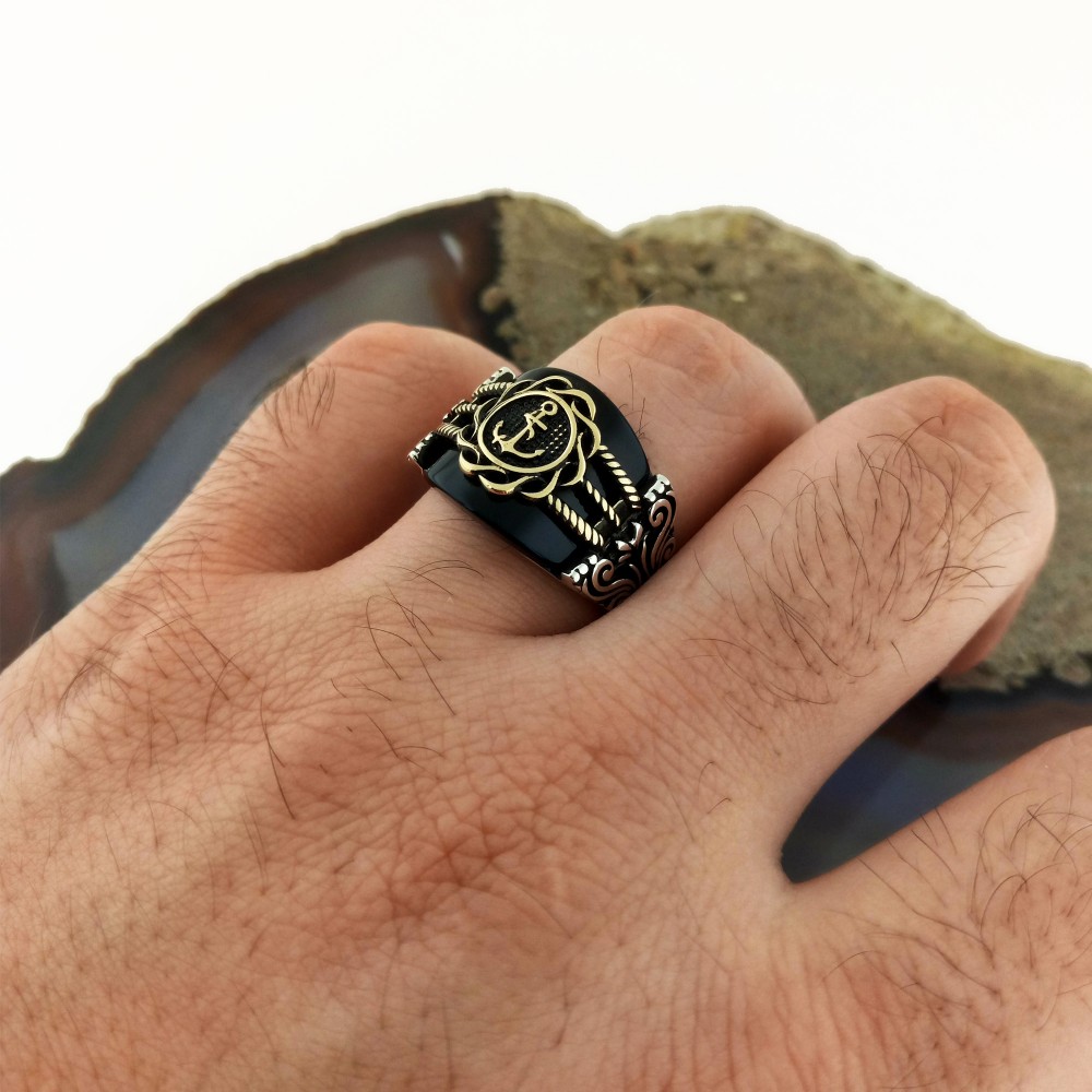 925 Ayar Gümüş Siyah Köprü Taşlı Denizci Çapası Erkek Yüzük