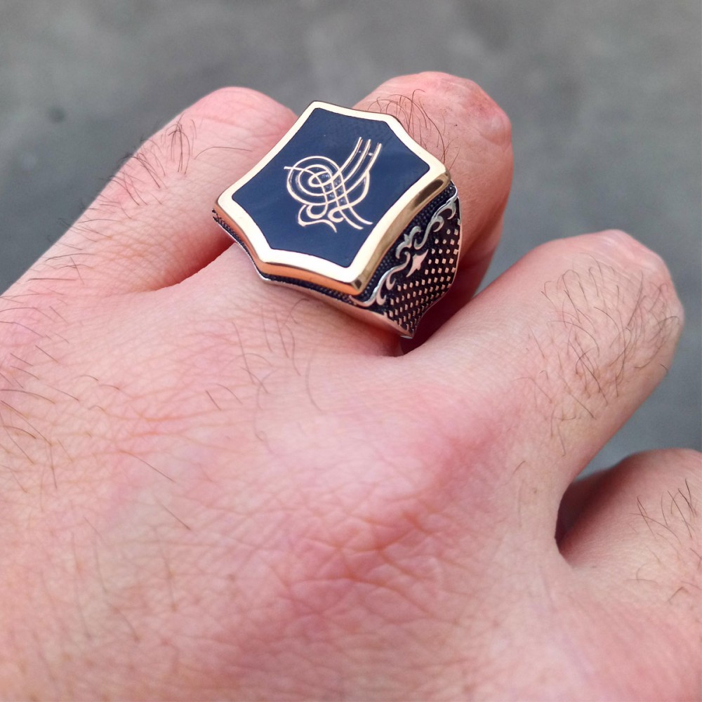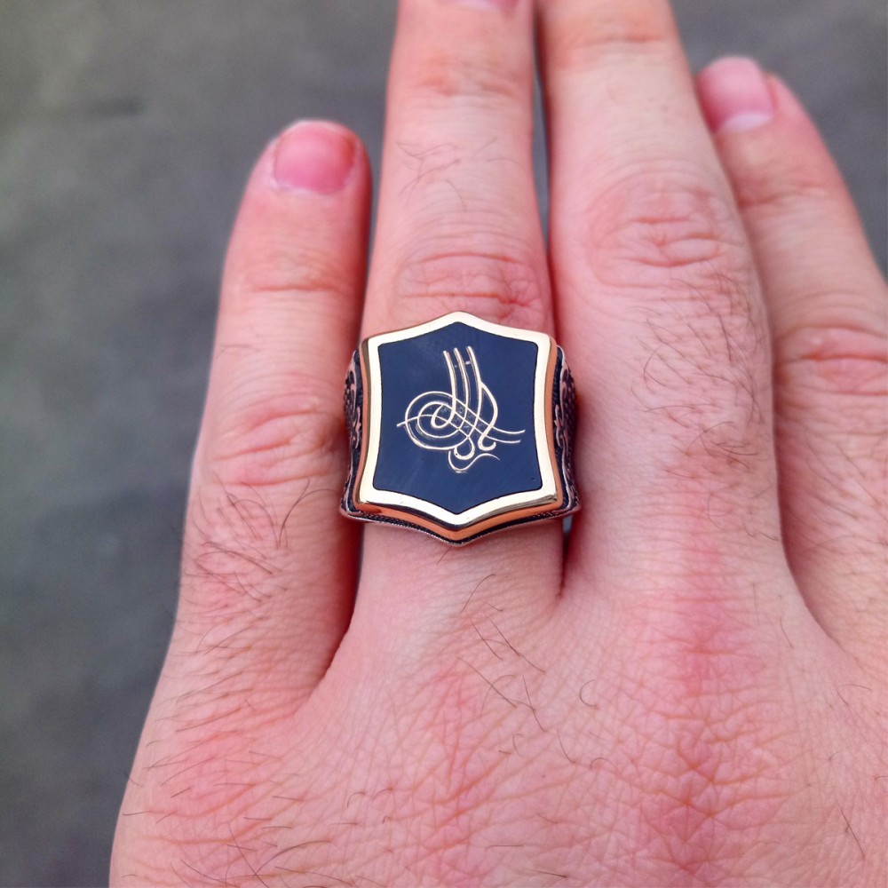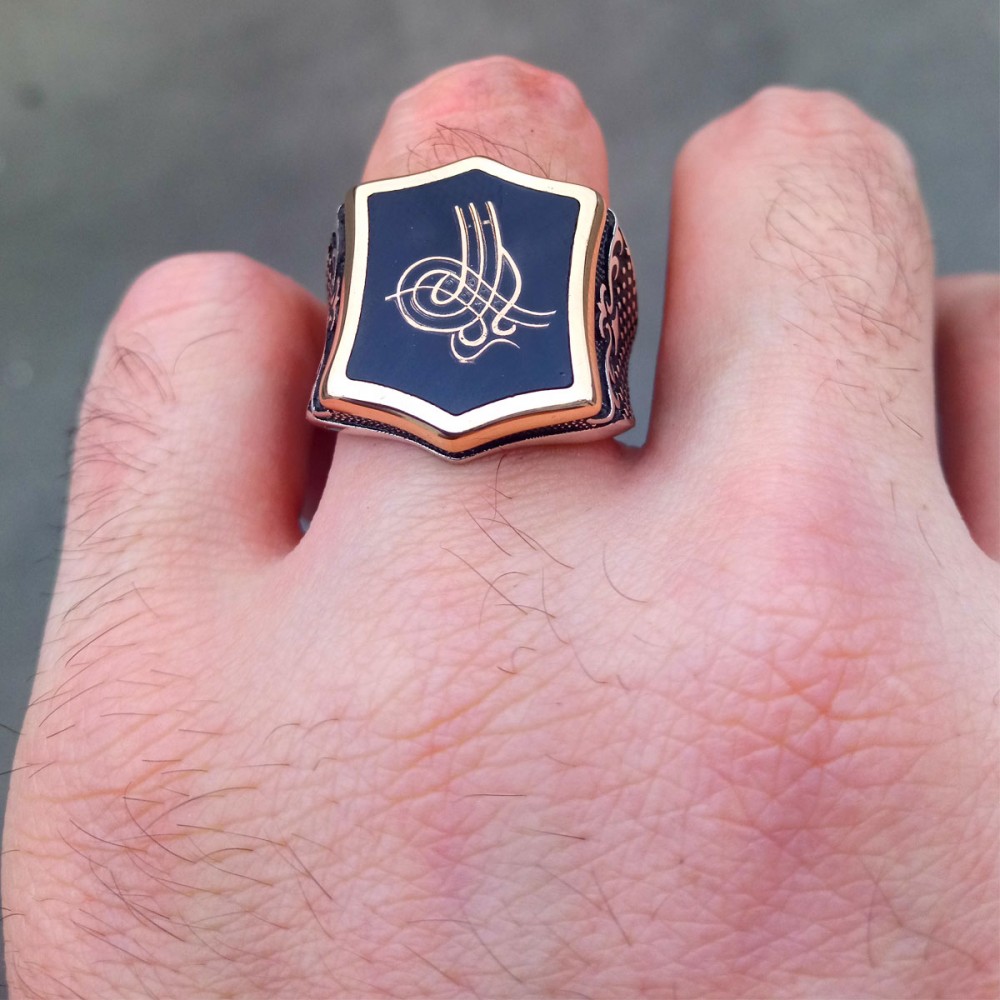 925 Ayar Gümüş Siyah Mineli Tuğra Motifli Erkek Yüzük