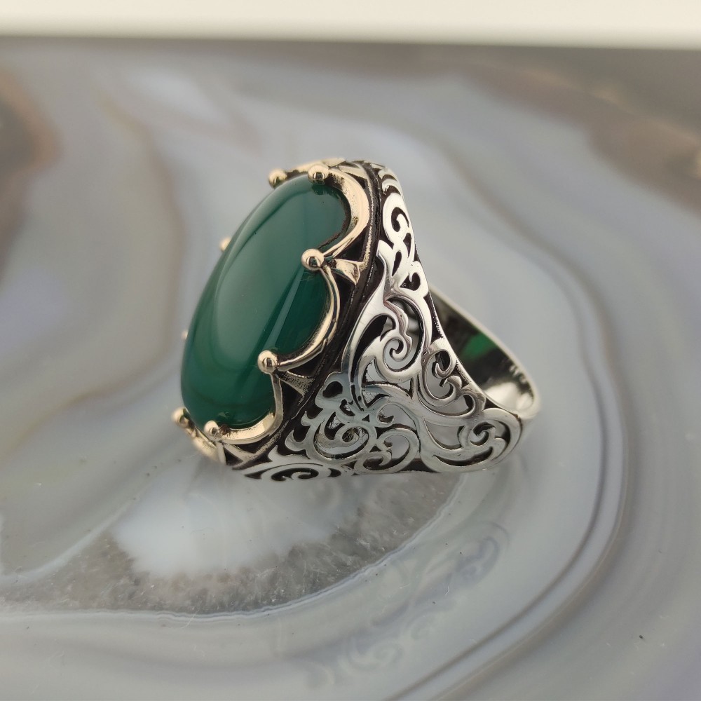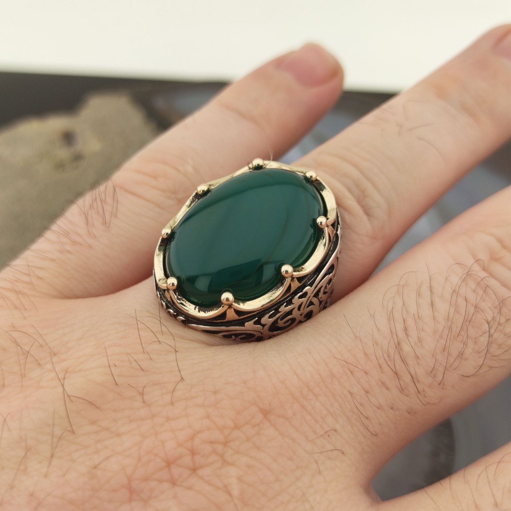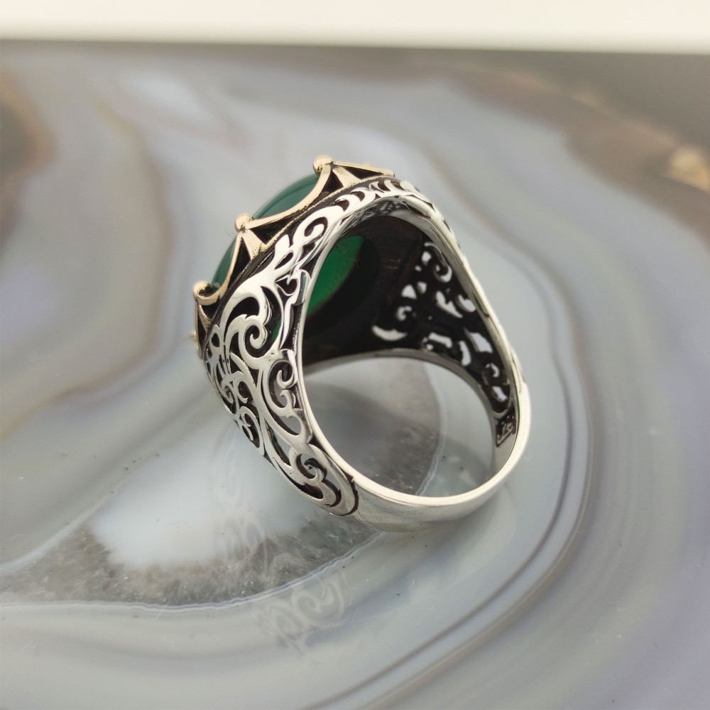 925 Ayar Gümüş Yeşil Akik Taşlı Kral Tacı Erkek Yüzük