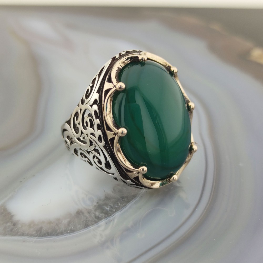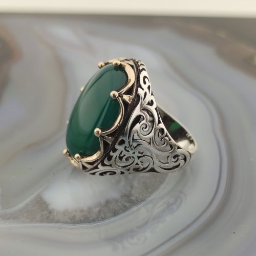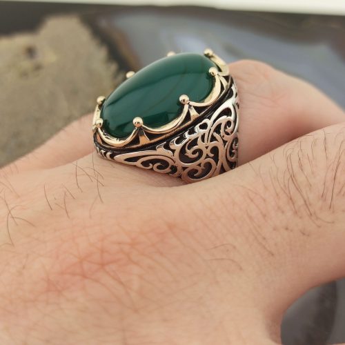 925 Ayar Gümüş Yeşil Akik Taşlı Kral Tacı Erkek Yüzük , firmamızın üretimidir.   Ürünlerimizin tamamı 925 ayar gümüşten üretilip doğal taşlar ile tasarlanmaktadır.  Ürünlerimiz Türkiye’ nin  her yerine sigortalı olarak gönderilmektedir.