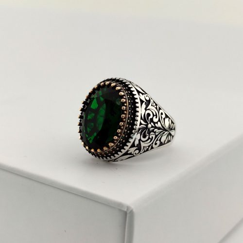 925 Ayar Gümüş Yeşil Taşlı Sarmaşık Desenli Oval Yüzük