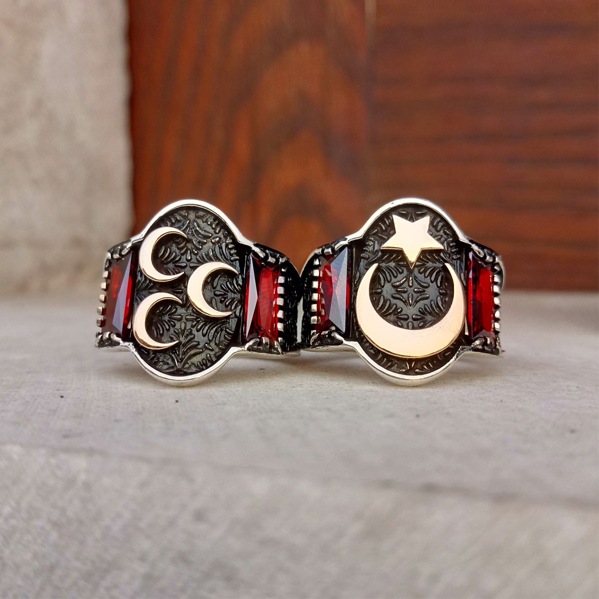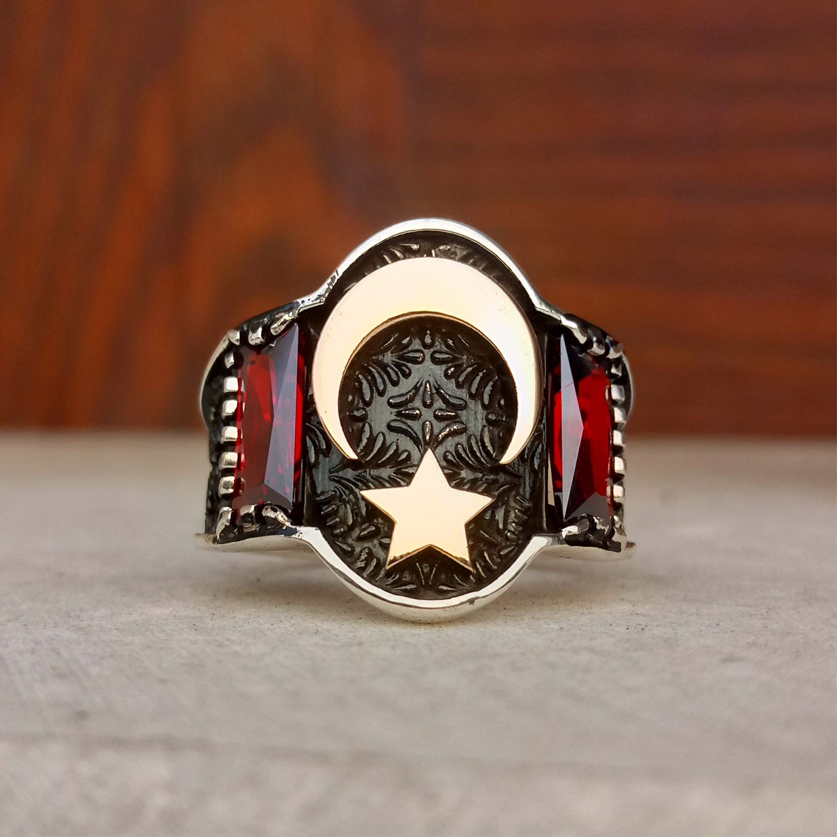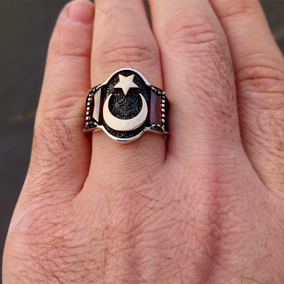 925 Ayar Kırmızı Baget Taşlı Ay Yıldız Erkek Gümüş Yüzük