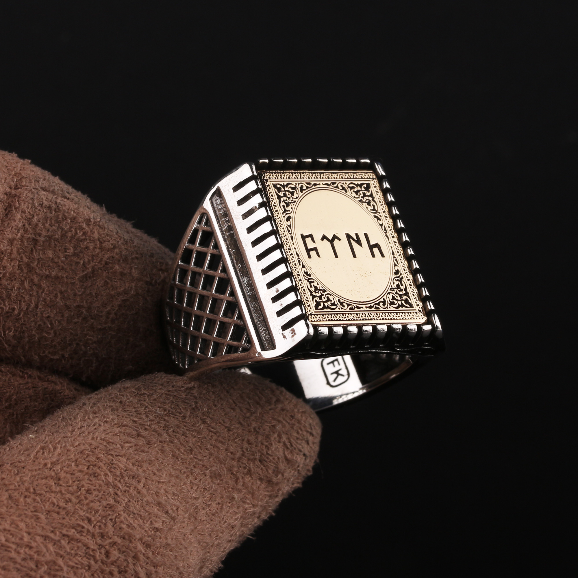 Yüzük üzerinde yer alan Göktürkçe Türk yazısı, milli kimliği ve tarihi değerlere bağlılığı simgeler. Özel işçilikle hazırlanan bu detay, yüzüğe güçlü, karakteristik ve anlamlı bir görünüm kazandırır. Oksitli yüzey yapısı sayesinde yazılar ve motifler daha belirgin hale getirilmiştir.