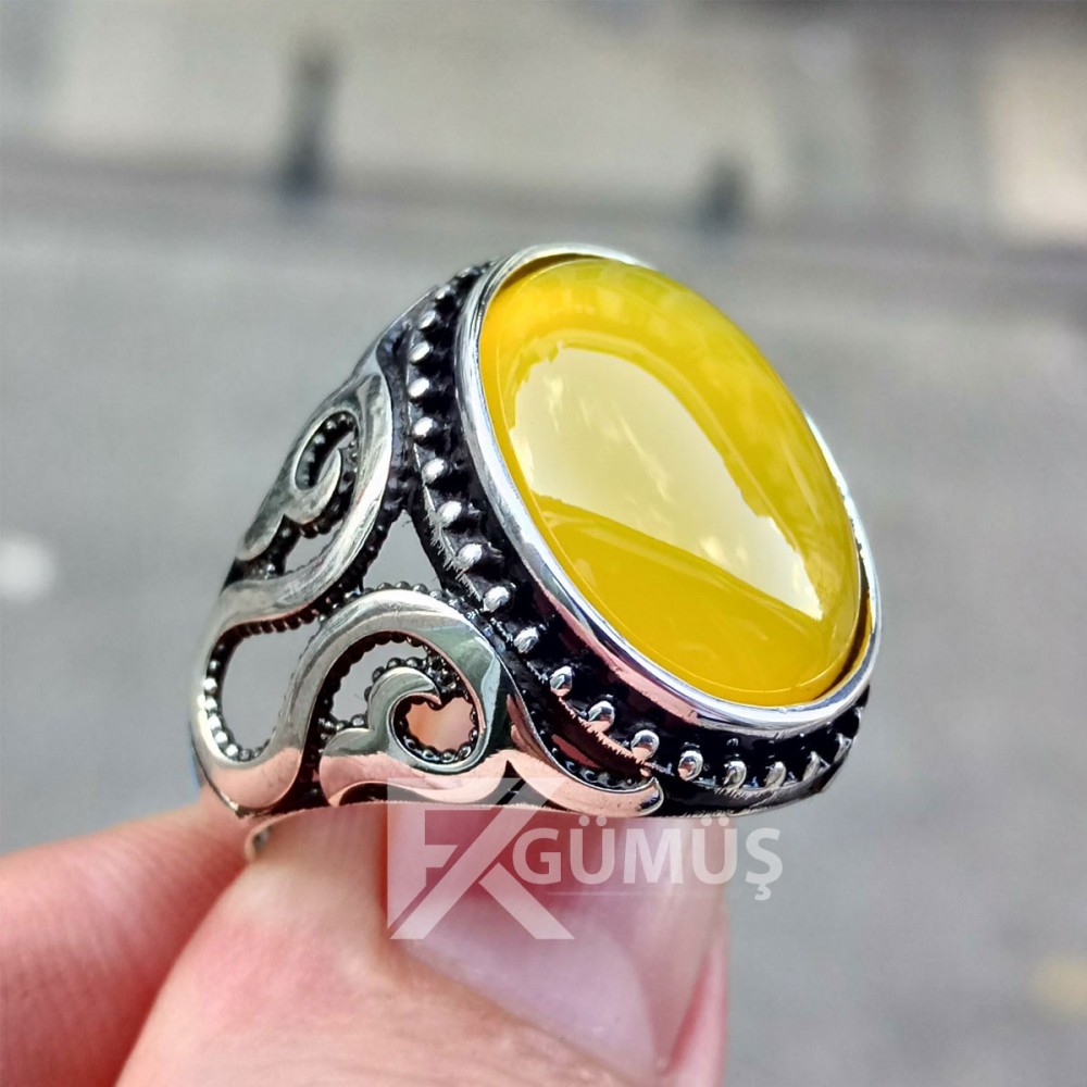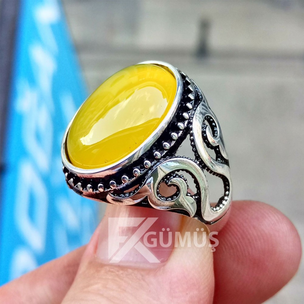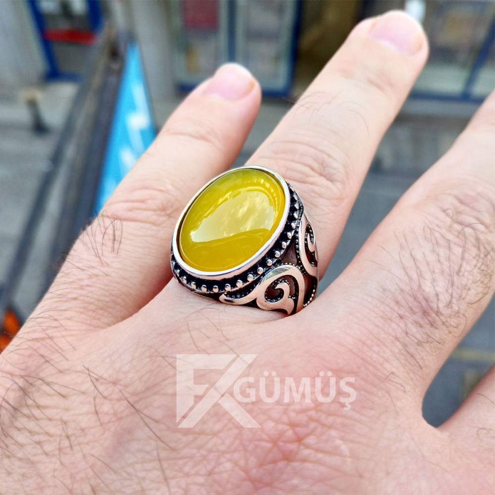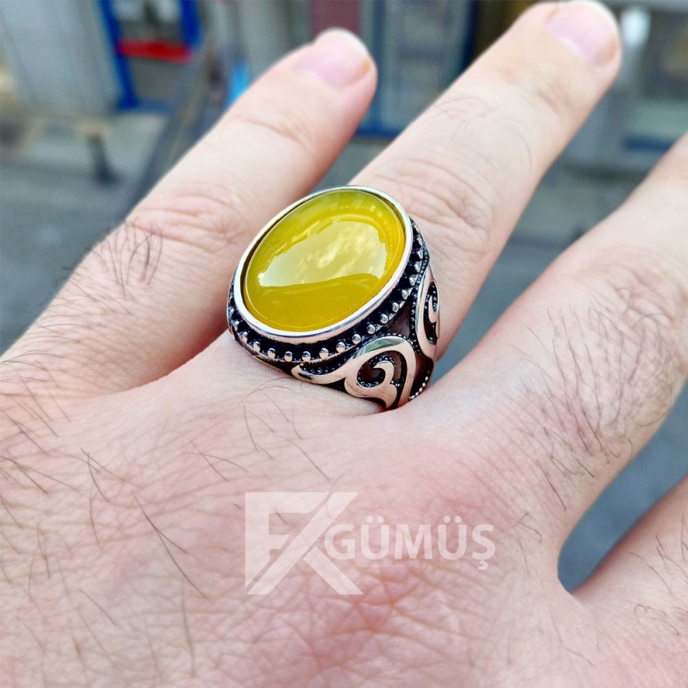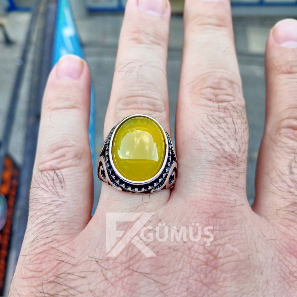 925 Ayar Gümüş Sarı Yemen Akik Taşlı Erkek Yüzük